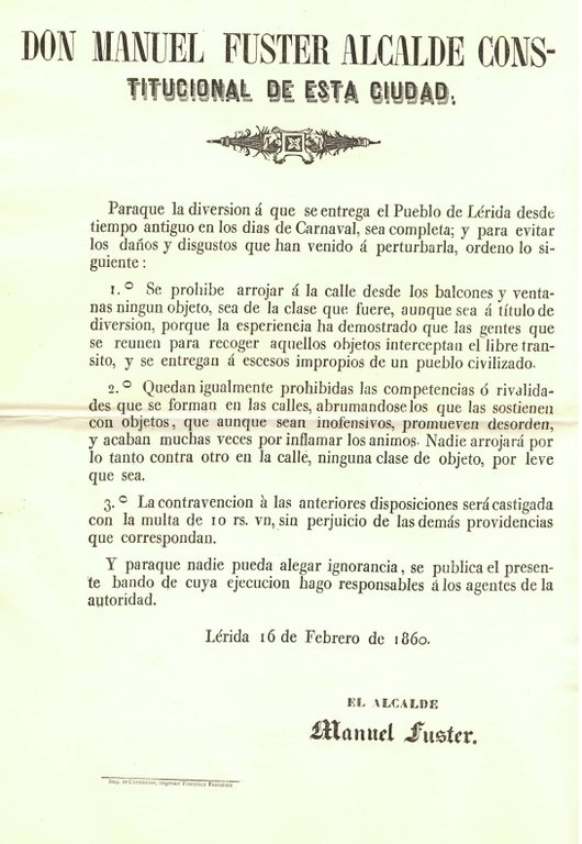 Ban de l’alcalde Fuster (1860) sobre el comportament dels ciutadans durant els dies de Carnaval