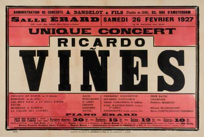 L’exposició mostra per primera vegada 16 cartells de diferents concerts del pianista lleidatà a París, a la Salle Érard, una de les més importants del moment. La col·lecció de cartells forma part del fons documental Ricard Viñes constituït per més de 1500 documents, entre ells: cartes, programes, escrits, fotografies, etc i que es conserva en l’Arxiu de la Ciutat.