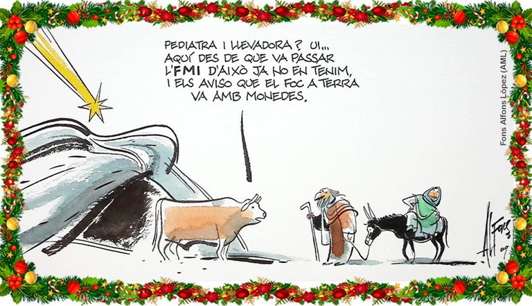 La imatge de la felicitació és un dibuix de l’Alfons López, publicat el 25 de desembre de 2009 al diari Público, i que forma part del fons que l'artista recentment ha donat a l’Arxiu de la Ciutat.