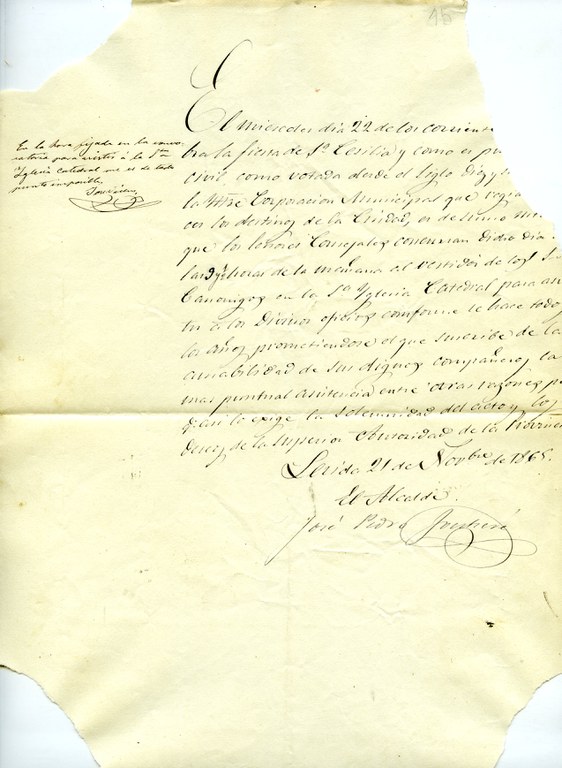 El document que us presentem en aquesta ocasió, és un dels documents més antic conservat a l’Arxiu Municipal referent a la Festa de Santa Cecília, datat el 21 de novembre de 1865, i signat per l’alcalde José Pedro Fontserè.
