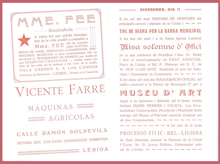 En ell podem veure com entre misses solemnes i processons es convida als lleidatans a l’acte d’inauguració del Nou Museu d’Art a la plaça Berenguer IV, posteriorment anomenada plaça del pintor Morera; ubicada prop de l'actual plaça España. Construït gràcies a la iniciativa de l’il·lustre artista lleidatà Jaume Morera i Galícia; esdevindrà la llavor del Museu d’Art Jaume Morera, que aquest any commemora el seu centenari. Desitgem que en l’any de la commemoració es faci realitat una seu definitiva per a la conservació de la important col·lecció que té el museu i que forma part del patrimoni artístic de l’Ajuntament de Lleida.