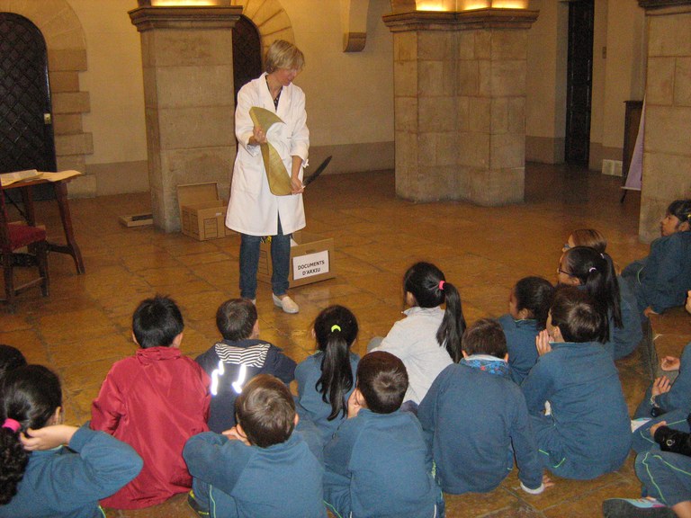 Al igual que el curs passat aprofitem les visites que fan els nens i nenes de 3er i 4art de primària al Palau de la Paeria, per explicar-los quines són les funcions i la tasca que desenvolupem els arxivers i arxiveres. A partir dels documents més antics que conservem a l’arxiu els expliquem que antigament es guardaven en l’Armari de les 5 claus que es troba dins la sala de l’arxiu municipal.