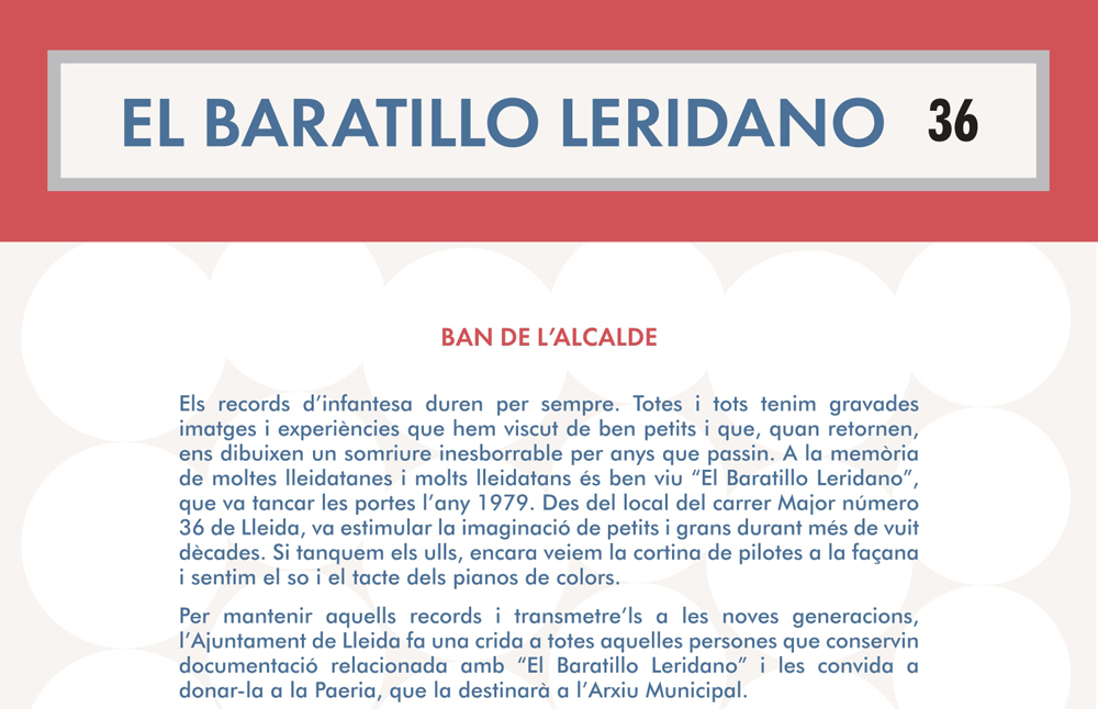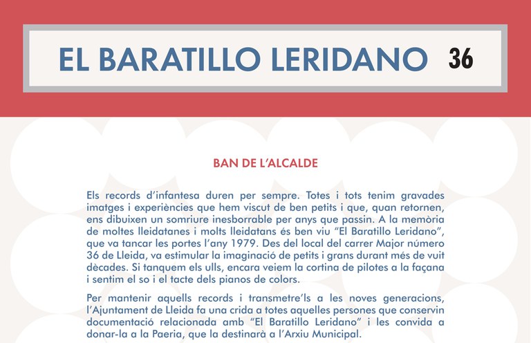 El alcalde Fèlix Larrosa ha hecho un llamamiento para que todos aquellos leridanos y leridanas que conserven en sus hogares documentación de la emblemática tienda El Baratillo leridano, hagan donación de ella a la Paeria. El objetivo de esta recogida es “mantener los recuerdos y transmitirlos a las nuevas generaciones” y reconstruir así una parcela de la historia de nuestra ciudad.