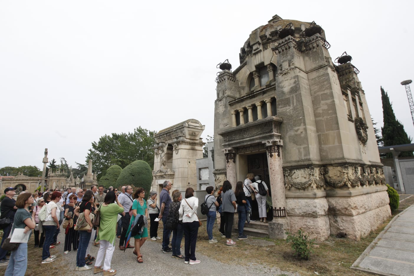 También pudimos acceder a la pequeña capilla donde se conservan, colgadas en las paredes, las lápidas más antiguas del cementerio. Pudimos leer algunas de las inscripciones más bonitas que algunos maridos dedicaron a sus esposas muertas a mediados del siglo XIX. Después paseamos hasta el departamento de Santa Cecília, donde realizamos una visita más artística y donde contemplamos el pórtico decimonónico del arquitecto Ramon Portusach, la nueva ubicación del nicho de Ricardo Viñes y también pudimos admirar los panteones más bellos de este departamento.